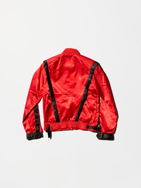 80s Made in U.S.A. It looks just like the jacket Michael Jackson wore in Thriller. Cool Red Satin Fabric. Cool Black Lines. Very Good Condition, Very Good Sizing. Super Cool.